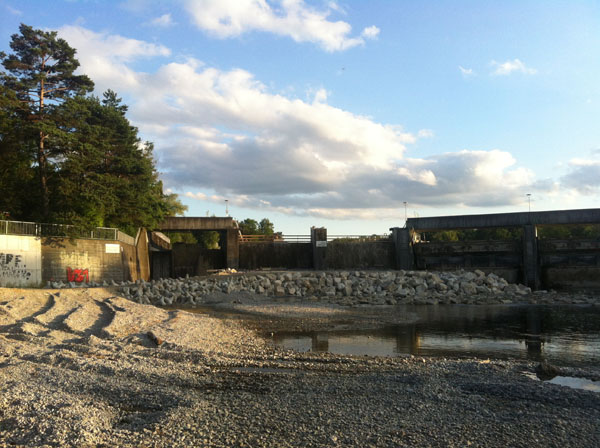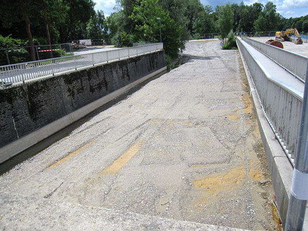 Montag, 16.07.2012 Ein breites Stück des Betongstegs über den Hochablass wurde heute entfernt.