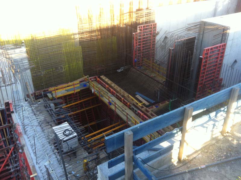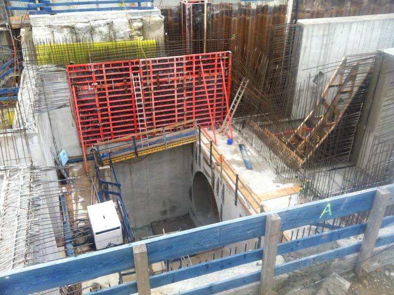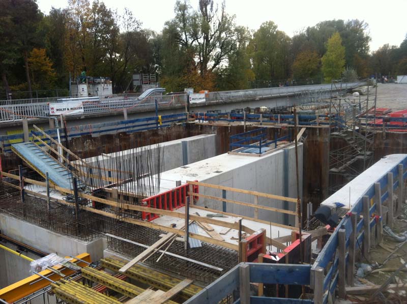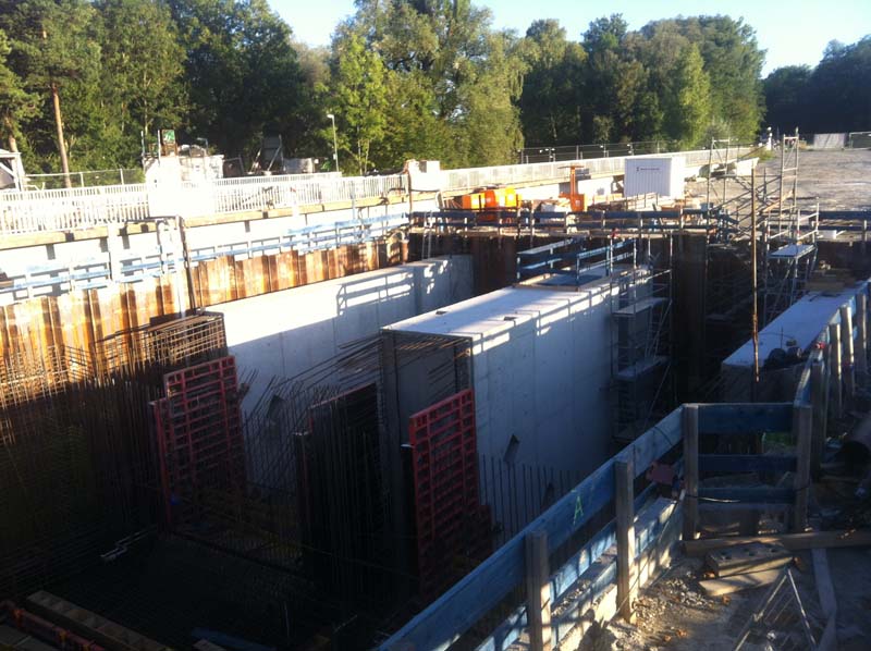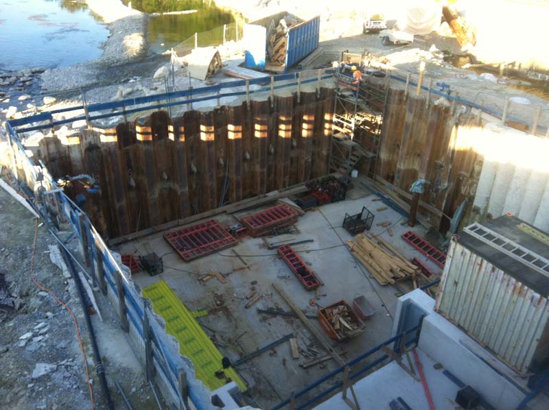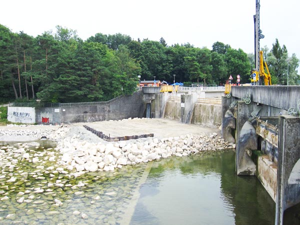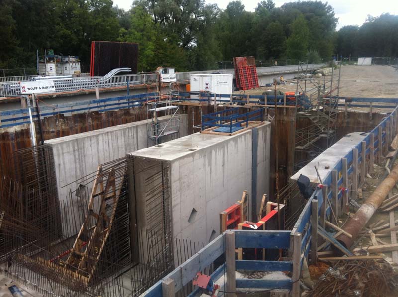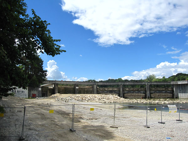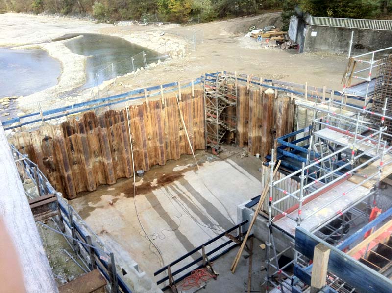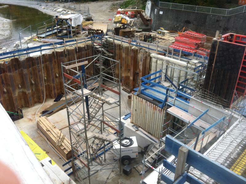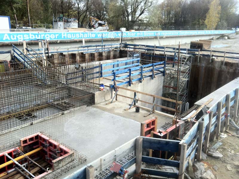 August 2013 Die Betonarbeiten sind ein gutes Stück vorangekommen. Die Trennwände für die zwei Turbinenkanäle stehen, viele Armierungen und Schalungen sind am zukünftigen Hochablasskraftwerk zu sehen.