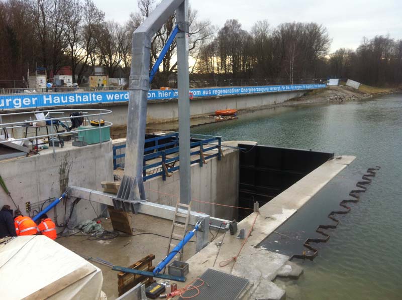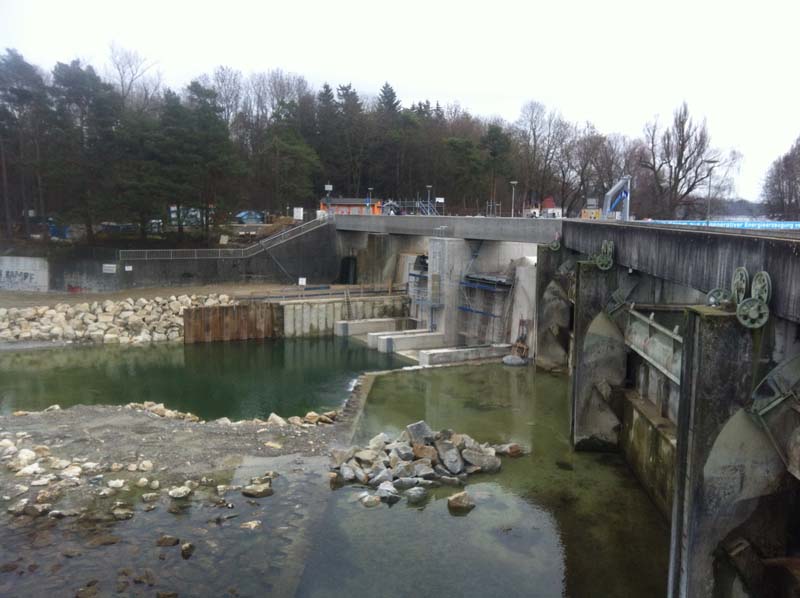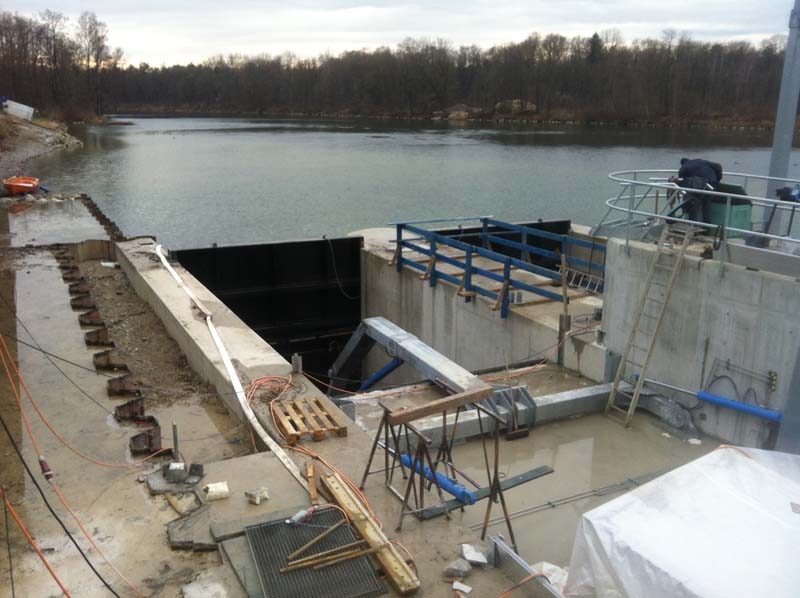 Dezember 2013 Nun scheint das Kraftwerk bereits fast fertig zu sein. Die Kiesbank vor der Baustelle im Lech wurde bereits abgetragen, das Wasser steht bereits direkt am Kraftwerk an.