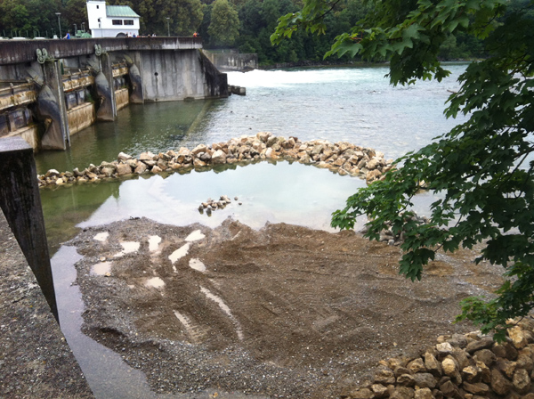 Sonntag, 15.07.2012: Die Kiesaufschüttungen oberhalb und unterhalb des Wasservorhangs scheinen abgeschlossen zu sein.