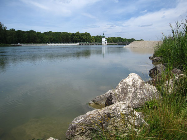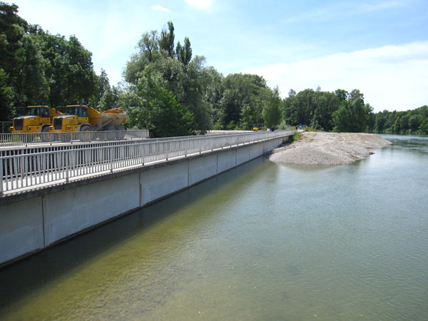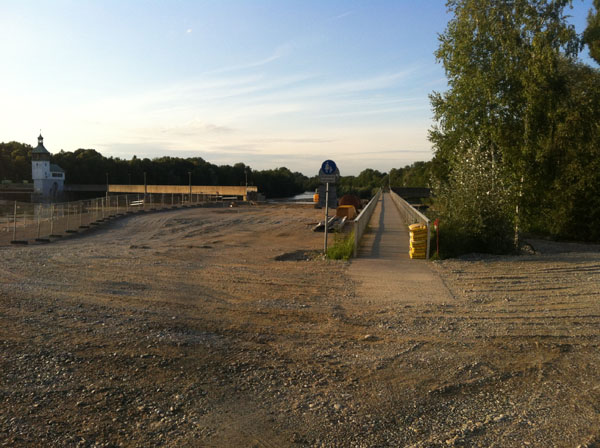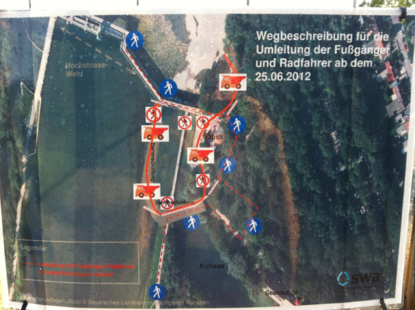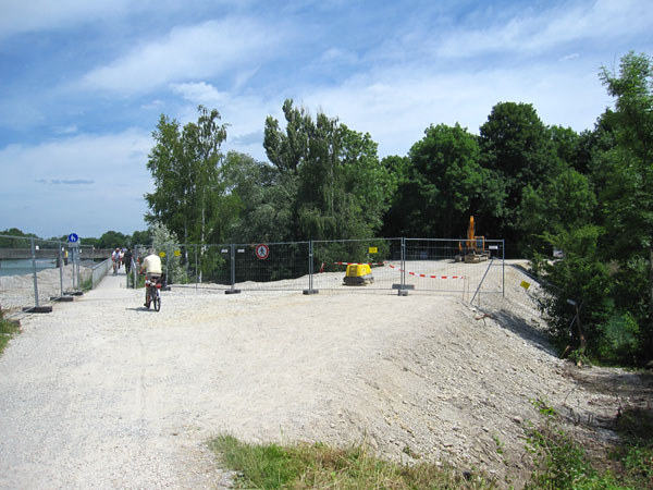 Sonntag, 24.06.2012 Da der Steg vom Hochablass zur Westseite des Kuhsees nun gesperrt ist, wurde ein künstlicher Überweg rechts vom Restaurant geschaffen, der den Baustellenfahrzeugen auch als Straße dient, um den Lech vor dem Hochablass mit Kies aufzuschütten.