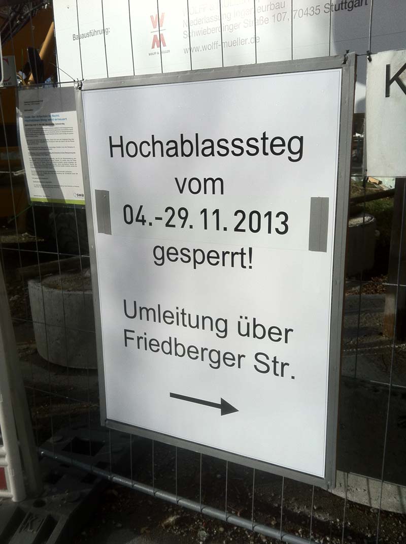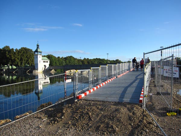 November 2013 Nach 1,5 Jahren wird der Hochablasssteg wieder errichtet. Hierzu muss der Steg vorübergehend komplett gesperrt werden.
