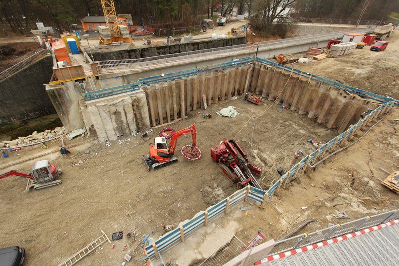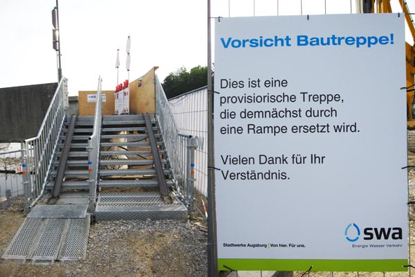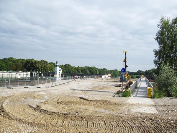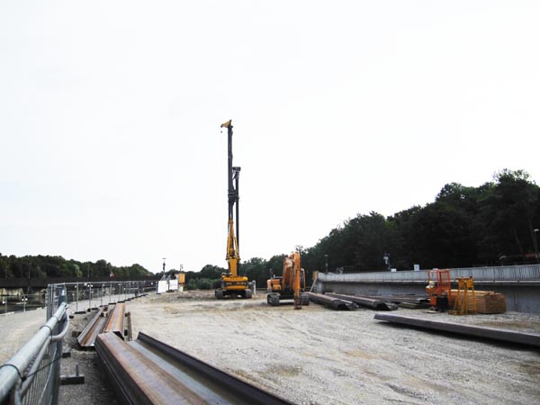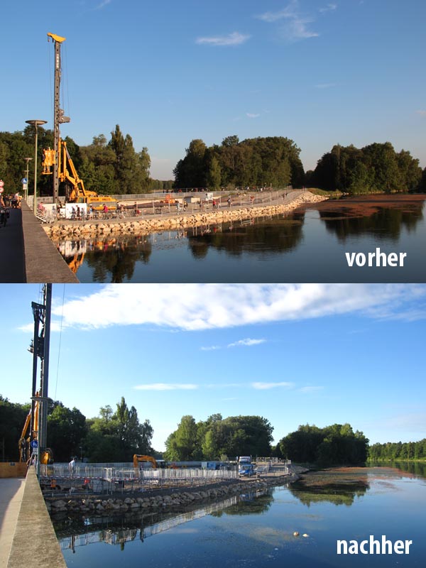 Sonntag, 29.07.2012 Immer noch wird der Boden gelockert, damit die Spuntwände eingeschlagen werden können und die Bautrube ausgehoben werden kann. Unterhalb des Hochablasses sind bereits Spuntwände eingeschlagen. Der Stein des Anstoßes, die provisorische Treppe, soll bald durch eine längere Rampe ersetzt werden.